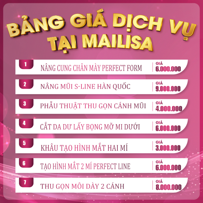 Thành lập từ năm 1998, sau hơn 27 năm đứng vững trên thị trường, thẩm mỹ viện Mailisa hiện đã trở thành một trong những thương hiệu thẩm mỹ viện chăm sóc sắc đẹp, một địa chỉ đáng tin cậy, hội tụ đủ 6 tiêu chí: Công nghệ thẩm mỹ hiện đại, đội ngũ nhân viên y tá bác sĩ chuyên môn cao tay nghề giỏi, dịch vụ thẩm mỹ hoàn hảo.... Trong suốt thời gian qua, Mailisa luôn là điểm đến chăm sóc sắc đẹp đáng tin cậy của khách hàng.